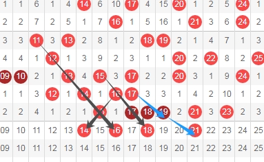 上图是福彩快乐8开奖号码走势分布图其中一部分,我标注出来的数字14 16 18看黑色箭头都是斜连号码,我标注出来的数字21看蓝色箭头是跨度二斜连号码,这里四个数字14 16 18 21。