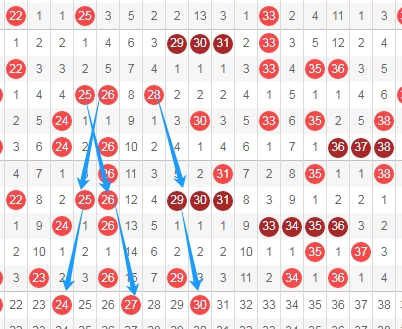上图是福彩快乐8开奖号码走势分布图其中一部分,我标注出来的数字24 27 30看蓝色大箭头都是隔三期斜连号码,这里三隔数字24 27 30。