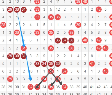 上图是福彩快乐8开奖号码走势分布图其中一部分,我标注出来的数字33 35 37看黑色箭头都是斜连号码,我标注出来的数字32看蓝色大箭头是隔4期斜连号码,这里四个数字32 33 35 37。