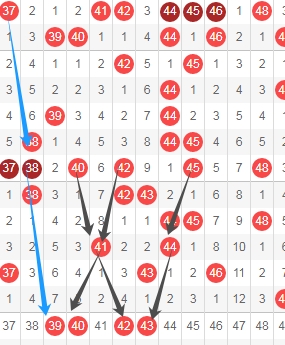 上图是福彩快乐8开奖号码走势分布图其中一部分,我标注出来的数字40 42 43看黑色箭头都是隔两期斜连号码,我标注出来的数字39看蓝色大箭头是隔5期斜连号码,这里四个数字39 40 42 43。