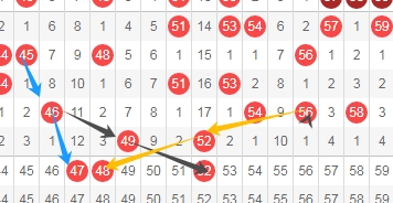 上图是福彩快乐8开奖号码走势分布图其中一部分,我标注出来的数字47看蓝色箭头是隔一期斜连号码,我标注出来的数字48看黄色箭头是跨度四斜连号码,我标注出来的数字52看黑色箭头是跨度三斜连号码,这里三个数字47 48 52。