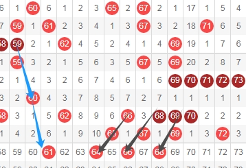 上图是福彩快乐8开奖号码走势分布图其中一部分,我标注出来的数字64 66 68看黑色箭头是斜连号码,我标注出来的数字61看蓝色箭头是隔两期斜连号码,这里四个数字61 64 66 68。