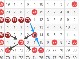 上图是福彩快乐8开奖号码走势分布图其中一部分,我标注出来的数字70 74看黑色箭头都是斜连号码,我标注出来的数字75看蓝色箭头是隔一期斜连号码,这里三个数字70 74 75。