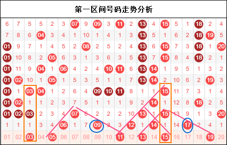 第一区间思路:一区出现四区的复制模式,前期热号全部转移为冷号集体消失,按照四区走势,接下来可能会出现集体性转移,前期的冷号代替热号出现,所以本期一区的思路很明确,除了走势上的防御之外,剩下的就是主攻前期冷码要频出的节奏。