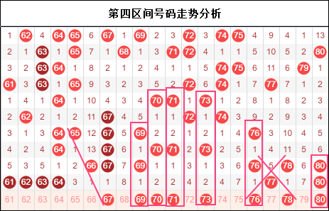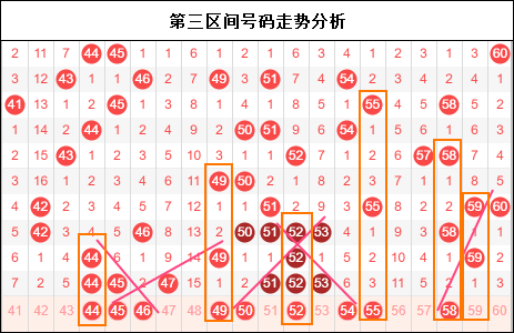 第四区间思路:四区前期不断铺垫号码,近两期出现号码转移的走势。从整体布局来看,号码中部放空,对于四区来说这是非常好的一个走势,至少我们可以看到,四区的常规走势回来了,所以结合前期的一个走势,这里在新的一期中必然会大量回补号码,这一点可以放心的去做。