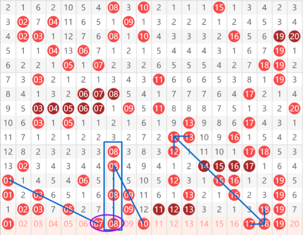 快乐8第2026046期01-20区域,推荐的第一个号码是07号,大家看到01到07的间隔一斜连,然后08和10的一个三角形走势。下来就是17、18和19这三个号码有可能会像上面的14、15、16那个一样继续往下走,形成一个倒金字塔,走势两边形成对称。那个01是上面开出02,然后再回过来给个01,有点像 12的走势。