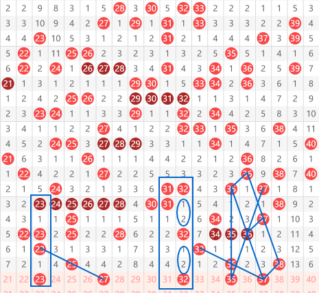 快乐8第2026046期20~40区域,二区推荐的第一个号码是23号,大家看到它有一个间隔一的对称走势,同时25斜着开出,23近期是比较频繁的。然后就是27号,我们看到23斜着25再给出27的一个间隔一斜连走势。下来就是32的间隔2对称走势,35的倒三角形走势,可以看到上面是35.37,间隔两期之后给个35.36。那么再间隔两期给出一个35,同时37号我们看到上面是36斜着开出35,间隔两期之后37斜着开出36,那么昨天开出了38,就很有可能开出37,形成一个对称走势。。