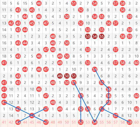 快乐8第2026046期41-60区域推荐的推荐的第一个号码是43号,我们可以看到47间隔一期开出45,再间隔一期给出43的一个间隔一斜连走势。而47我们看到从41间隔一给了43,再间隔一给45,再间隔一给47的间隔一斜连走势,52和54考虑形成一个倒三角走势。上面一个52间隔一期给出52.53,那么再间隔一期给出52.54的三角形走势,同时54我们看到三个56向上开出30,55,间隔一期给出54,那下面有可能对称开出一个54,最后就是59号间隔一走势。