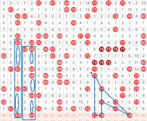 快乐8第2026046期61-80区域的推荐推荐的第一号码是62号,我们可以看到是一个间隔3,间隔2,然后再间隔3的走势。而64号一直是一个间隔2的走势,不管上面是双重还是没有重,都是间隔2的走势。然后就是73和74两个号码近期开出同样的走势,特别多。然后就是78号看到74写着间隔一期给出76,再给出78的两重斜连间隔一走势。