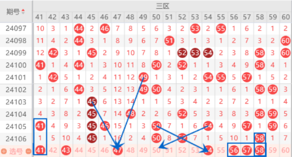 该区间的43号数字是属于遗漏10期的号码,本期遗漏10期的号码有3个,有很大机会出一个号码的,我们重点关注一下43 56号数字出一个号码的情况就行了。本期的50 54号数字我们注意一下,属于交叉对称号码,是有机会出一个号码的,我们重点关注一下54号数字的出号情况就行了。本期的54号数字我们注意一下走重的情况。