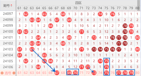 本期的67号数字是属于遗漏8期的号码,本期遗漏8期的号码有6个,是有机会出一个号码的,所以本期这里的67号数字我们可以重点关注心意啊。本期的69 70号数字我们关注一下,这里是有机会出一个号码的。本期的75号数字我们注意一下出三重的情况。本期的73 76 79 80号数字是属于2路号,遗漏2期没有出号码了,本期也是有机会出号的,我们重点关注一下73 76 79号数字的出号情况就行了。