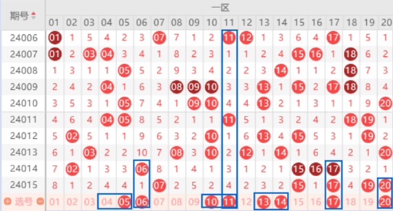 该区间的05 06号数字我们注意一下同出的情况,重点关注一下06号数字的出号情况。上期08 10 12 14号数字没能出号,那么本期就有很大的机会出号了,我们重点关注一下10 14号数字的我出号情况,这里应该是要出一个号码的。本期的11 13号数字我们也是要注意出一个号码的情况。上期开出了15 17 19 20号数字,那么本期我们就要注意一下出重号的情况了,重点关注一下17 20号数字出重的情况。