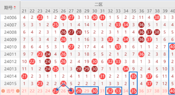 本期的25号数字我们注意一下出号情况,属于252走势,出号机会还是很大的。本期的27号数字是属于5115走势,也是可以防守一下的。三连号28 29 30号数字本期我们注意一下回补一个号码的情况,重点关注一下28 30号数字的出号情况。连号32 33号数字我们注意落下一个号码的情况。本期的38 39 40号数字我们注意一下出一个号码的情况,重点关注一下40号数字的出号情况。