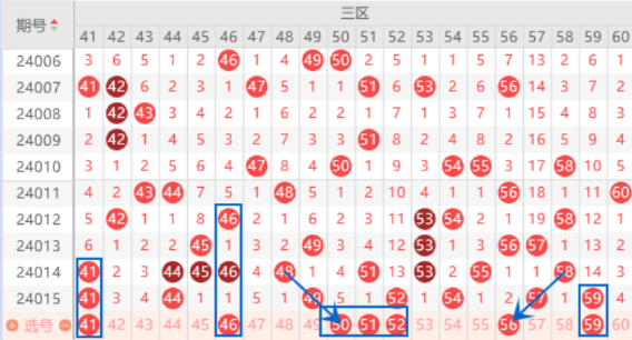 该区间的41号数字我们注意一下走三重号的情况。本期的46号数字是属于复制号码,出号机会还是有的,我们需要注意一下。在5字头区间50 51 53 56都是属于三斜连号码,本期我们要注意出一个号码的情况,重点关注56号数字的出号情况。本期的59和52号数字都是属于冷号出号情况,本期我们注意出一个重号的情况。