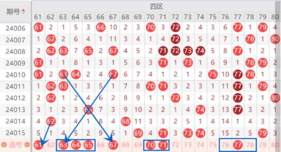 该区间的63 67是属于交叉对称号码,本期我们注意出一个号码的情况,尤其是67号数字又是1路号码,1路号码已经遗漏5期没有出号了,本期是有机会出一个号码的,我们需要重点注意一下64 67号数字的出号情况。上期开出了69 71 73 74号数字,本期我们注意出一个夹号和一个重号的情况,我们重点关注一下70 71号数字的出号情况。本期的76 77 78号数字应该是要回补一个号码了,本期我们重点关注一下77 78号数字的回补情况就行了。