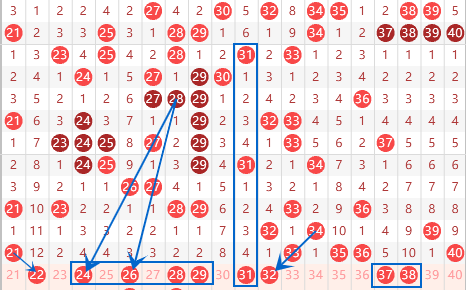 本期的24-29号数字我们要注意一下,有可能会出现3个号码,我们可以重点在这里抓一下胆码,尤其是24 25的落号情况,这里落下一个号码的是比较大的,我们要注意了,26 27号数字我们也是要注意落下号码的情况。本期的31号数字是属于空4对称号码,本期我们可以做一下防守的。本期的32我们也是关注一下的,如果42号数字出来了,那么就没有32号数字什么事情了。