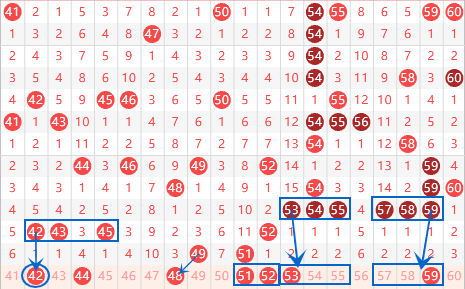 连号空一带号42 43 45上期没能出重号,本期我们要注意防守直落的情况,重点关注一下42号数字的出号情况。夹号44号数字的回补我们也是要注意一下的。上期开出了49号数字,那么本期我们就要注意48 50号数字的出号情况了,重点关注一下48号数字的出号情况。三连号53 54 55和三连号57 58 59的落号情况,本期我们就重点关注一下57 58 59的落号情况就可以了,其中的58 59可以重点挑一个胆码出来。