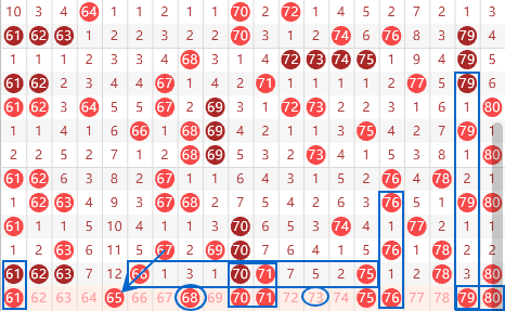 上期开出了三连号61 62 63,本期我们也是要注意落下重号的情况的,本期的重点关注一下61 62落下重号的情况。本期的65号数字我们可以关注一下,它是属于遗漏12期的号码,本期有两个,有机会出一个号码的。本期的68 73号数字我们也是要注意落下一个号码的情况,重点考虑一下68号数字的落号情况就可以了。上期开出了70 71号数字,本期我们要注意落下一个重号的情况,重点考虑一下71号数字走重的情况。本期的76 77我们也是要注意出一个号码的情况。本期的79号数字我们也是要防守一下的,有可能会被夹出来的。