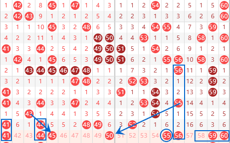 上期1路号码开出了41 44,本期我们要注意一下出重号的可能性,重点关注44号数字走重的情况。连号45 46已经同时遗漏5期了,本期我们要注意落下一个号码的情况。该区间我们需要重点关注就是58 59 60的出号情况了,这里出号机会很大,可以抓一胆码出来的。