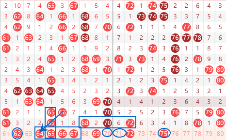 在62-72之间本期我们要注意了,有机会出一个三连号出来,我们可以把重心放在这里,做一组三连号的防守。上期开出的68 70 72是属于3连空一出号,本期我们要注意一下出一个夹号一个重号的情况。在7字头区间,本期我们要注意71 74 77的出号情况,出一个号码的问题不大。