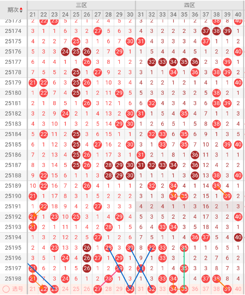 四区开出:33,34,37,38 奇偶比: 2:2 和值:142 跨度:5,上期开出4个号码,奇偶数号码均衡。本期三斜连走势:33,隔码斜连走势:32。近5期出号量:3-3-1-2-4,近10期平均出号2.2枚,上期奇偶比: 2:0。本期推荐关注号码:32、34、35、39。