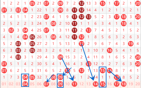 该区间上期开出了连号04 05和连号08 09,本期这里应该是要开出重号来的,我们可以重点关注一下04 09号数字出重的情况。本期的07号数字是属于遗漏7期的号码,本期遗漏7期的号码有四个,出1-2的可能性很大的,我们要注意一下。11号数字和9 10号数字形成了3斜连号,可以关注一下。本期的15号数字是属于191走势,出号机会还是有的。