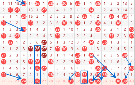 本期的24号我们要做一下防守,上期开出21号数字,本期很容易带出24号的。26号数字是空一对称,可以关注一下。本期的34号数字我们可以重点关注一下,本期连号32 33和连号35 36有可能把34号数字夹出来的。本期的35 36我要防守出一3重的情况。本期的38号数字和34 36形成了三斜连和40 42也形成了三斜连,出号机会还是有的。