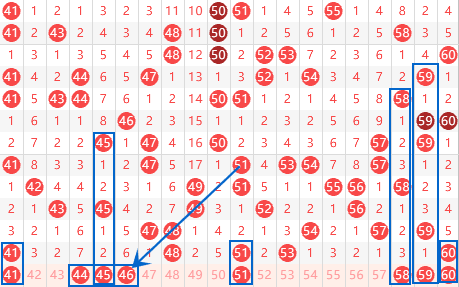 上期开出了41 51,那么本期我们就要注意出重号的情况了,重点可以关注一下51号数字走重的情况。本期的45号数字是属于空二对称,46号数字又是断斜连对称,所以本期我们要防守一下45 46的同出情况。本期的59号数字是属于131走势,可以关注一下。