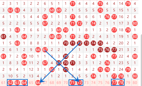 本期的62号数字我们可以关注一下,它是否会为下期出63做准备呢?本期的66 72都是断斜连对称号码,本期可以关注一下这里出一个号码的情况。上期开出了77 78,本期我们要注意一下这里出重的情况。