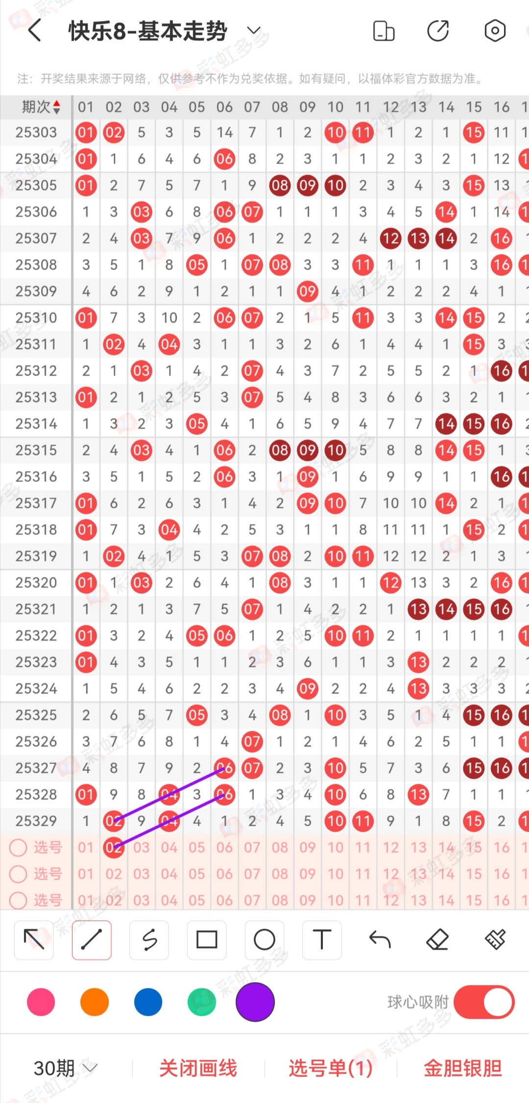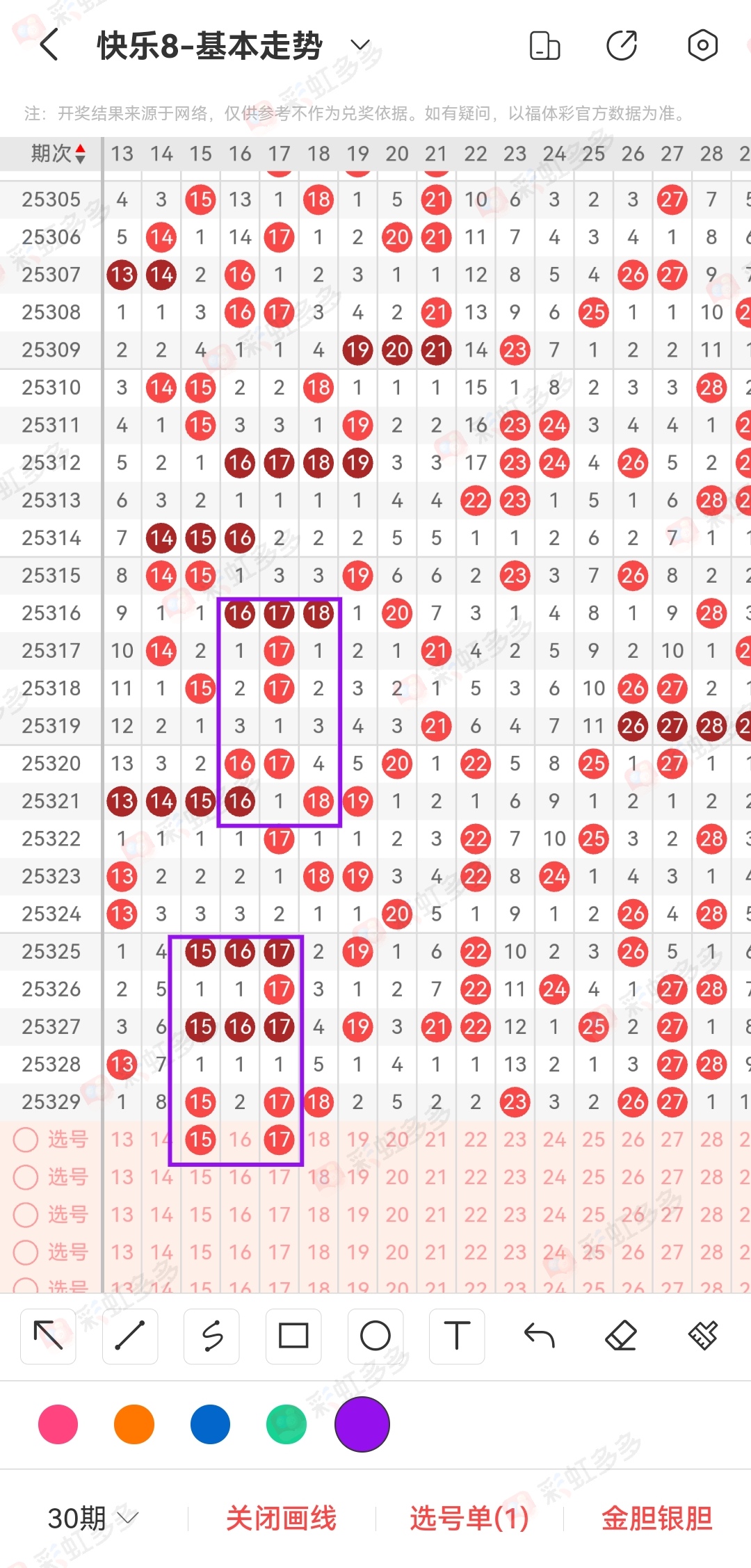 第二个地方就是考虑一下1头的稳定区域,这里的数据能有什么变化呢,无非就是走重和不走重。重号的选择无非就是15 17 18,不走重就是16 19。虽然话是这样子讲,但是每一个位置的点位都是能够延伸的非常多的东西。所以这里不能够轻狂。就好像昨天的2头,稳定对称,直接全部没有,所以这里的逻辑需要大家理一理。越是明显的的号码越容易草率。所以这里的号码不给大家点位定位。但是一开始的02真的看好。