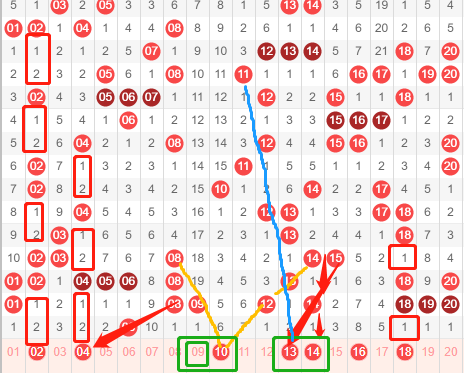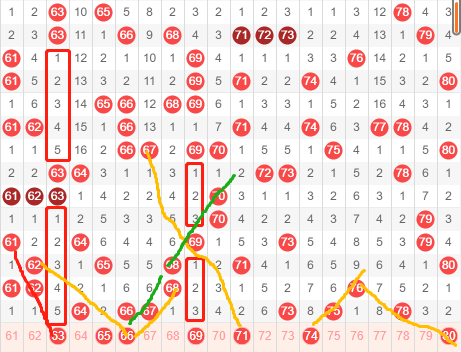 第四区间号码61-80,四区上一期咱们预测要走热,倒也没让人失望,尤其是号码75,跟上一起的76一样,同期遗漏走下来,似乎近期这样的走势挺热衷的。第四区间除了走势外,大家注意绿色线条的标注。