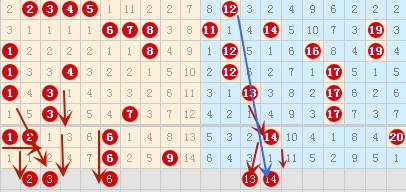 上图中1 2这两个连号在上期没落号,那么这期应该是要落一个号的,可以重点考虑一下。13号数字我已经追2天了,这期还不出就可以放弃了。14号数字在历史开出的期数中空一跳类型比较多的,这里可以考虑下。