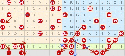 上图中23 24连号空一带21号数字这种类型的落重号是最频繁的,可以选一个重号。31 32 34这三个号码也是前面那种类型可以考虑选一个重号和一个邻号。上期开出了2个5斜连,那么本期会不会有一个5斜连突破6斜连呢,所以这里的37号可以考虑一下。