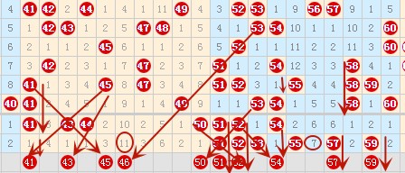 上图中41 43 44这三个号码也是我前面提到过的类型,在上期没落号,那么这期必然要有1-2个号码开出,可以着重考虑下。在51-60号数字这个区域在上期开出了6个号,令好多人都措手不及。这期亦可以把重心放在这个区域,出号这么密集,应该必有重号,以考虑重号为主。