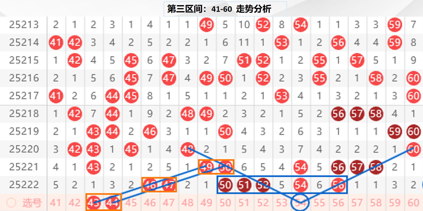 三区分析:【41-60】(走势图标注号码非小黄车大底,请谨慎参考,具体思路将在直播间分享讨论)