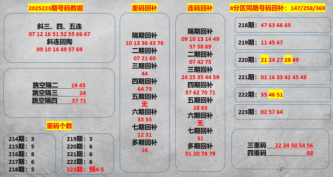 上期四区的整体开号中在区间还是保持着形态上的不放空回补,且在同形态上是出号的重点。以区间近期的出号模式上判断,本期在61 72 80的同形态孤码下方还是要特别注意出号上的选择,但也要注意可能还是会出现放空点,三码中可考虑一重一分边一放空的布局模式。而在空位中的出号考虑在周期上的接力会不要中,以区间当前周期上的出号模式判断,本期小周期号码中关注在64 70 75 76的位置选择,区间只要空位开号都会带有小周期的号码出现,本期在四码中可重点考虑1-2码的布局选择。而在温冷周期中也要关注接力周期上的出号表现,区间在冷周期的持续回补中做对应点位的判断选择,号码中在63 65 74 77 78的空位中关注出号,做1-2码的布局选择。