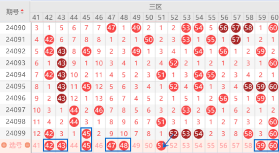 上期开出了42 45号数字,本期我们注意出一个重号的情况。本期的43号数字是属于重号回补号码,我们注意一下出号情况。本期的47号数字是属于遗漏9期的号码,本期遗漏9期的号码有2个,我们注意出一个号码的情况。本期的48号数字也是遗漏10期的号码,本期遗漏10期的号码也是有2个,本期我们也是要注意出一个号码的情况。本期的59号数字我们注意一下出号情况,属于夹号类型,走势也是可以的。