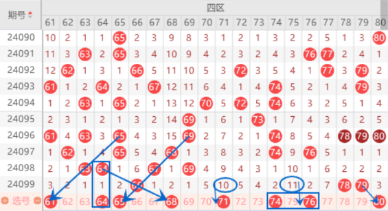 本期的61号数字是属于斜连号码,我们关注一下出号情况。本期的63 64号数字我们注意一下出一个号码的情况,重点关注一下64号数字的出号情况就行了。本期的65号数字是属于212走势,我们防守一下出号情况。本期的68号数字是属于斜连号码,64 66 68的斜连开的比较频繁,我们要注意一下。本期的71 75号数字我们要注意出一个号码的情况,都是属于冷号,而且又在同一断区内,出一个号码的机会是比较大的。上期开出了78 79号数字,那么本期我们注意一下80号数字的出号情况。