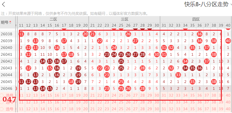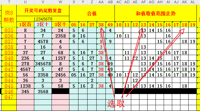 首先,设定11-18八个号码为"1区"定百位、21-28八个号码为"2区"定十位、31-38八个号码为"3区"定个位。