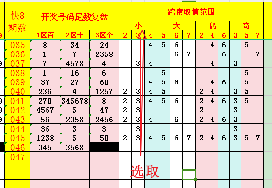 3区个位:上期本区全黑,本期看好尾数456,侧重46尾,号码为34-36