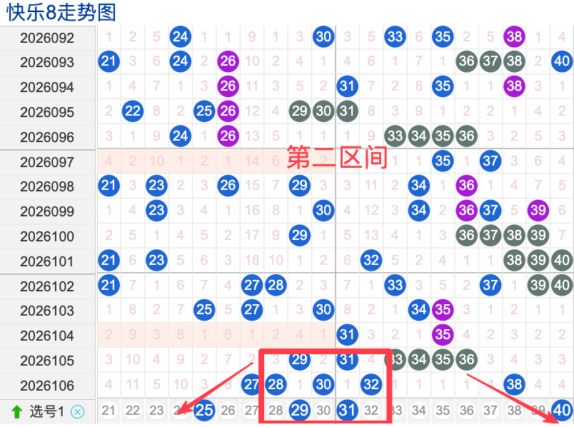 上期二区开出5个奖号(27.28.30.32.38)上期回顾二区开出5个奖号二区间在上期落位同比前期的话呈现了一个递减落位趋势,先来看本期号码25整体活跃度较热,在近 30 期里有一定的间歇性出现,不是每期都开,近期整体走势还是很稳定。号码31近期热度较温热,间隔性整体比较好,说明其在当前阶段活跃度较热注意防守。号码29近期活跃度较热有一定的间歇性近期整体走势相对还是很稳定没有特别明显的冷热趋势变化,号码40近30期内活跃度较热,没有明显的连续出现形态走势,整体表现比较热。