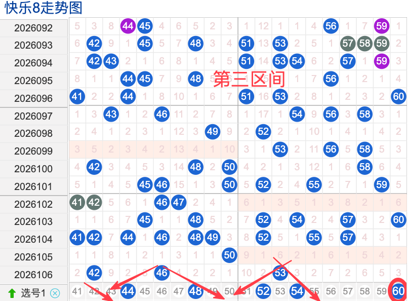 三区间开出了3个奖号(42.46.53)上期回顾三区开出3个奖号上期的三区间的奖号数量呈现一个递增的形态,4头回补两个,5头回补1个号,本期先来看号码44期出现频率相对来说还是很稳定。时间隔期数也是很稳定,是在近期的开奖中较热注意防守,号码48在近 30 期内出现次数相对是稳定的号码,近期的活跃度也是较热。号码52有一定的间歇性,通常间隔5-10期会出现一次,没有明显的连续出现态势,走势相对还是不很稳定,在整个第三区间的表现较温热本期还是可以防守的。号码54走势相对近期较热,近期没有连续间隔落号的情况,活跃度近期处于热状态注意防守。