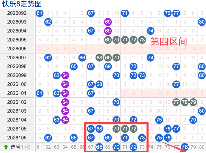 上期四区间开出了8个奖号(62.65.67.69.71.73.75.76)上期的四区开8个奖号呈现了一个递增趋势,开出的奖号6头回补4码,7头回补4个,先来看号码68在近 30 期内属于不是稳定的号码,近期出现频率相对温热,偶尔会间隔多期后出现一次,这个号码要注意防守,号码70具有一定的间歇性近期活跃度是很稳定比如有时会间隔3到8期就再次出现,有时会间隔多期,近期整体出现频率比较温热,近期还是要关注的.号码72活跃度近期比较温热,有一定的间歇性,整体走势有一定的波动性.