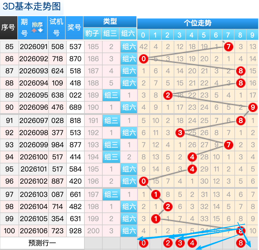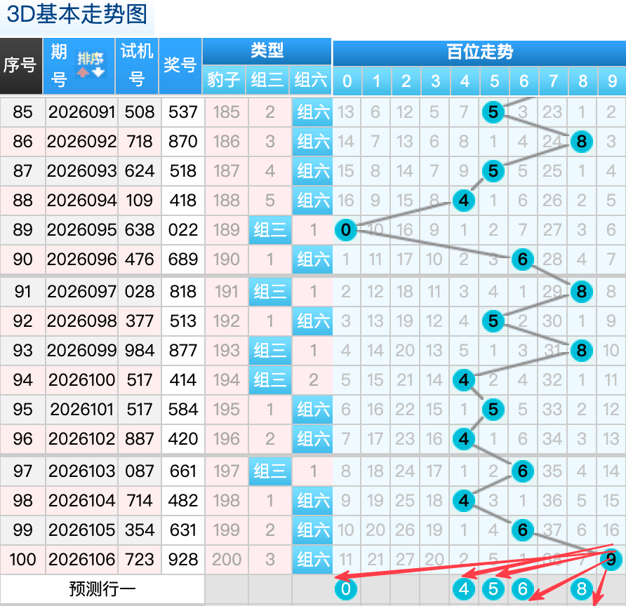 3D上期百位开出9号球,这个奖号9是一个冷码的回补落位趋势也是一个比较好的符合百位上的落位点,先看8号球这里还是有机会继续走出一个热号码顺位的落位趋势还是要注意防守的,还有一个就是0号球这里的是9跨落位形态在这里的机会还是很好的要注意防守,然后4号球这里要注意是一个折返落位回补趋势注意防守,9号球在百位上要注意可能有机会走出重码落位的回补概率 。