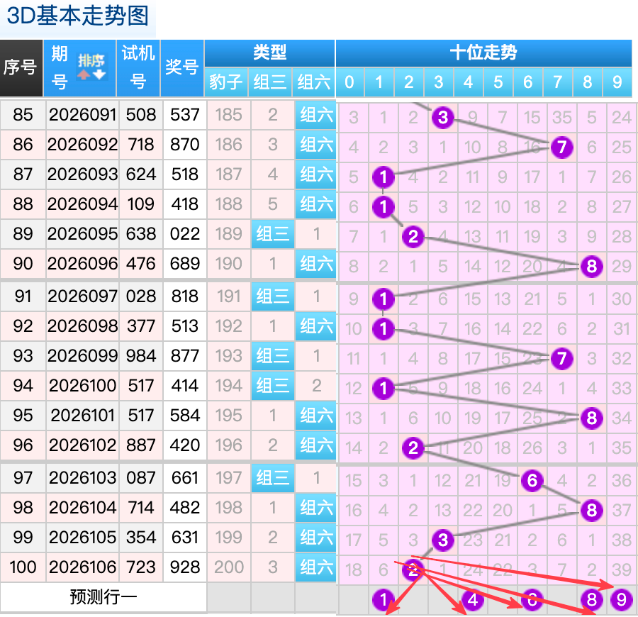 上期3D十位开出的奖号2号,上期在十位上2号球这个号码是一个顺位回补码的落位点,本期来看1号在十位上要注意这个号码是有机会继续走出热号顺位码落位的趋势这里的号码回补形态注意防守就好,再来8号球这个点位注意防守走出6跨号码的落位趋势。9号球这个大冷号的错位落位回补要注意参考。3号球要注意走出折返号的落位回补。
