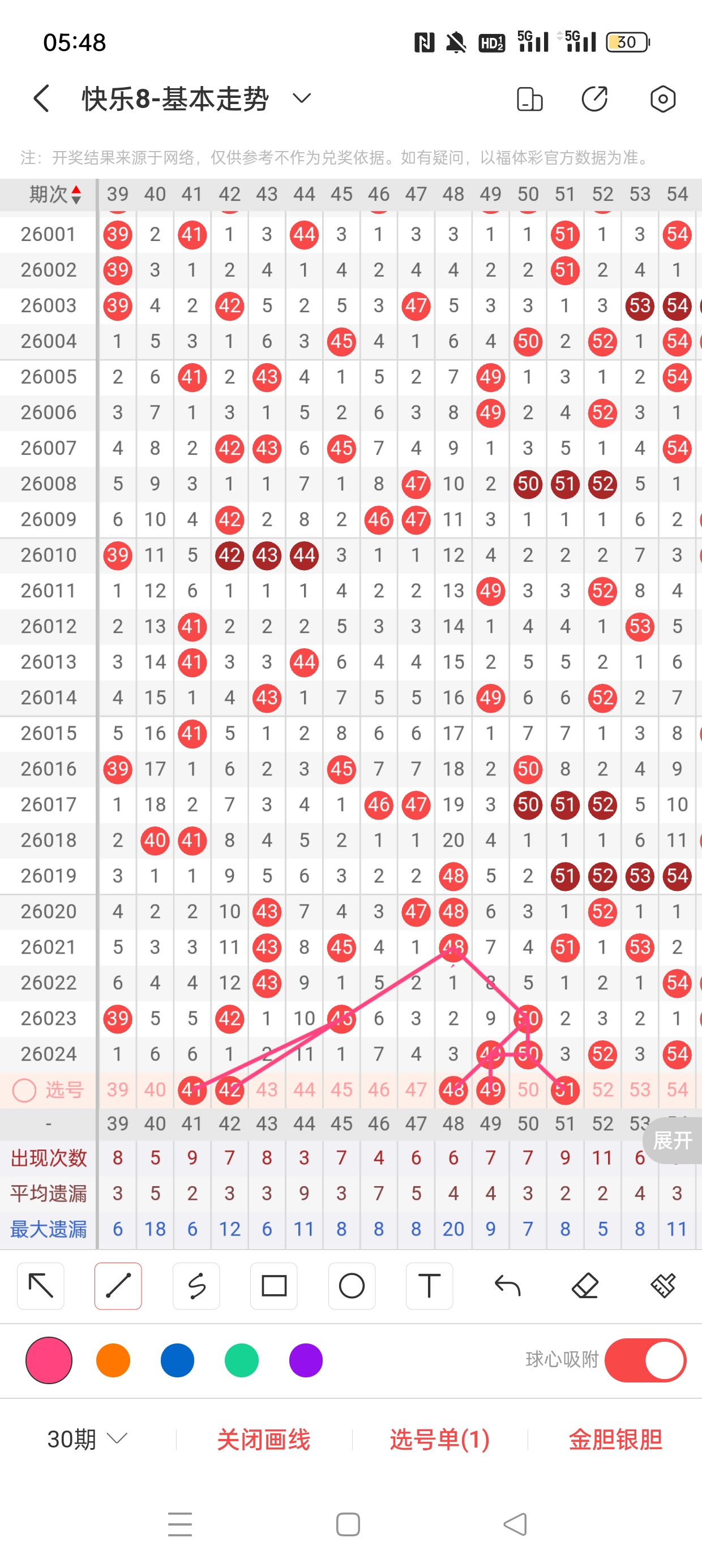 奇偶比13:7,和值765,区间比:4:6:6:4,同尾比值2:3:5:2,重号:36,连号:36、37。总结完毕,下面开始本期分析。