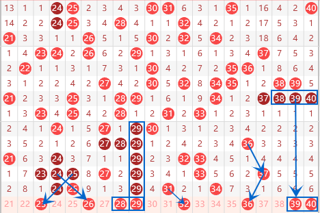 上期开出了24 25的重号,本期我们要注意一下23 26出号的情况,重点关注一下26号数字出重的情况。本期的29号数字我们可以防守一下出6重号情况。本期的32号数字我们可以关注一下,前面有32 33 34的斜连,那么本期有可能开出了31 32的斜连的。本期的连号38 39 40本期我们也是要注意落下号码的情况,重点关注一下39 40号数字的出号情况。