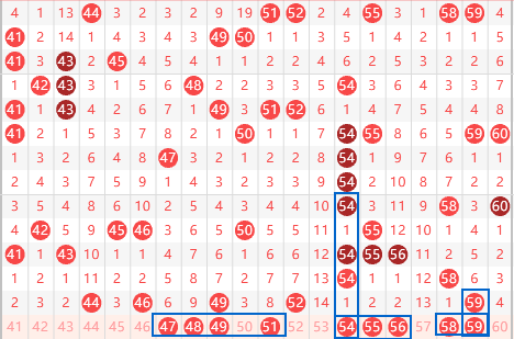 上期开出了46 49 52这种空二连号的类型,那么本期我们就要注意一下中间数47 48 50 51号数字的出号情况,这里应该是有号码出来的,我们重点关注一下48 50的出号情况就可以了。本期的54号数字我们可以关注一下,它是属于空一对称号码。55号数字是属于5432的走势,做一下防守就可以了。