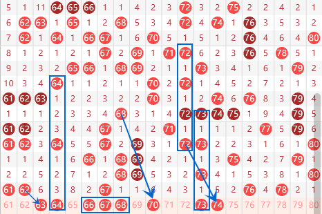 本期的64号数字我们可以关注一下,是属于空三对称号码,由于近期的空三对称出的比较频繁,所以本期的空三对称号码50 64我们一定要注意一下。上期开出了67号数字,本期我们要注意它走重的情况及分边的情况,这里有可能会出现连号的情况。本期的73号数字是属于4连空一对称号码,有可能会走72号数字的走势,我们可以关注一下。