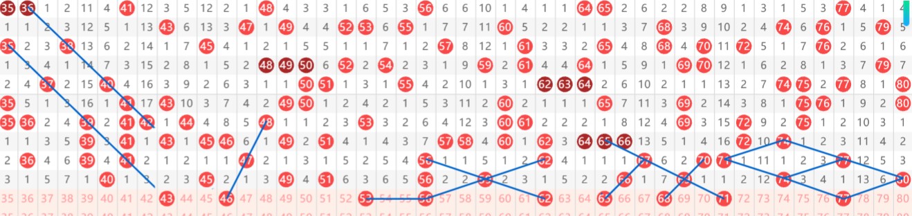 【第二区间41-80】:上期开出9个号码。本期推荐:43-46-56-62-65-68-71-77八个号码。43-46斜连号码,同路形态在4头开出考虑;56同路号码,以区间同尾出号考虑;62逐渐走热,考虑与三斜连的65-68和四斜连的71在此号段四连同路号码开出趋势;77其走势与上期44一模一样,有望开出。区间推荐重点号码:三小区间46-56,四小区间65-68-71-77。